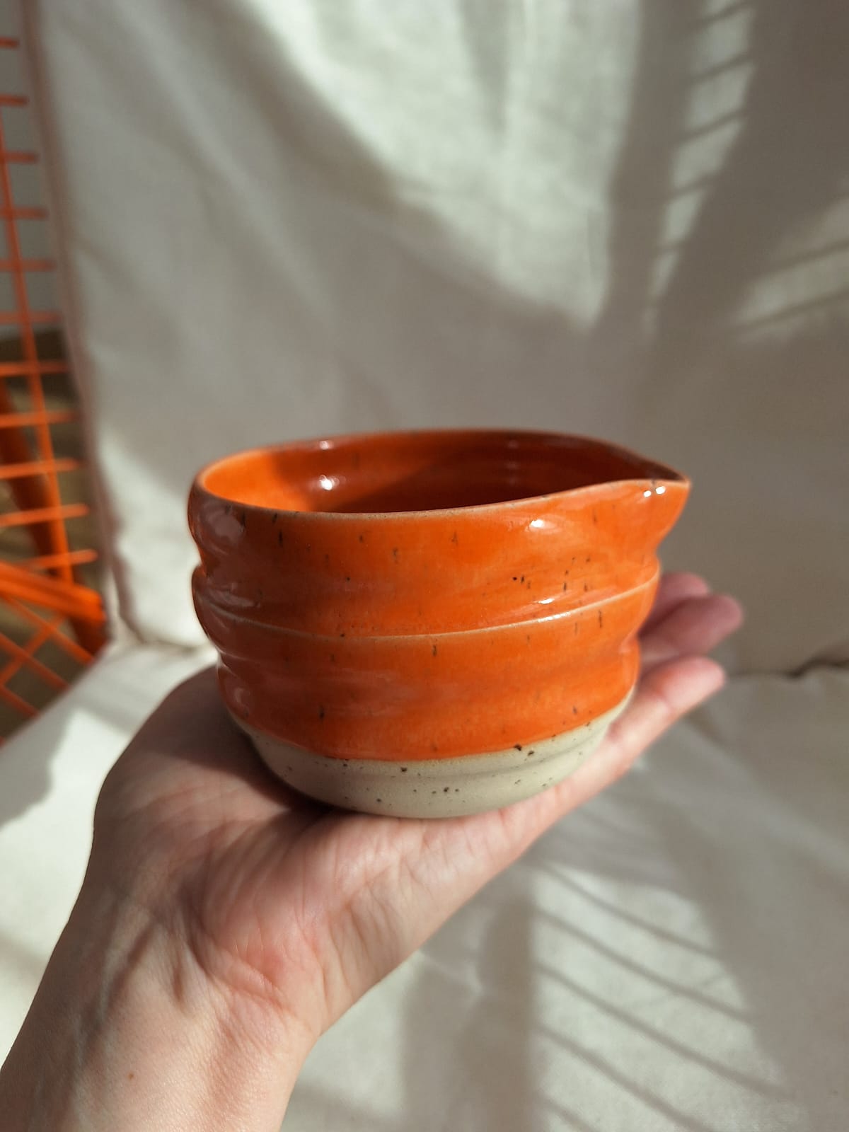 Domluvily jsme se na tom, že miska bude mít organický tvar, praktickou výlevku, a taky, že vznikne z netradiční tečkované hlíny. A pak už bylo potřeba JEN otestovat správnou glazuru na testovacích výpalech, které proběhly na začátku léta. Nakonec u nás obou vyhrála kombinace oranžové a karmínově žluté, která působí "teple" a připomíná západ Slunce.