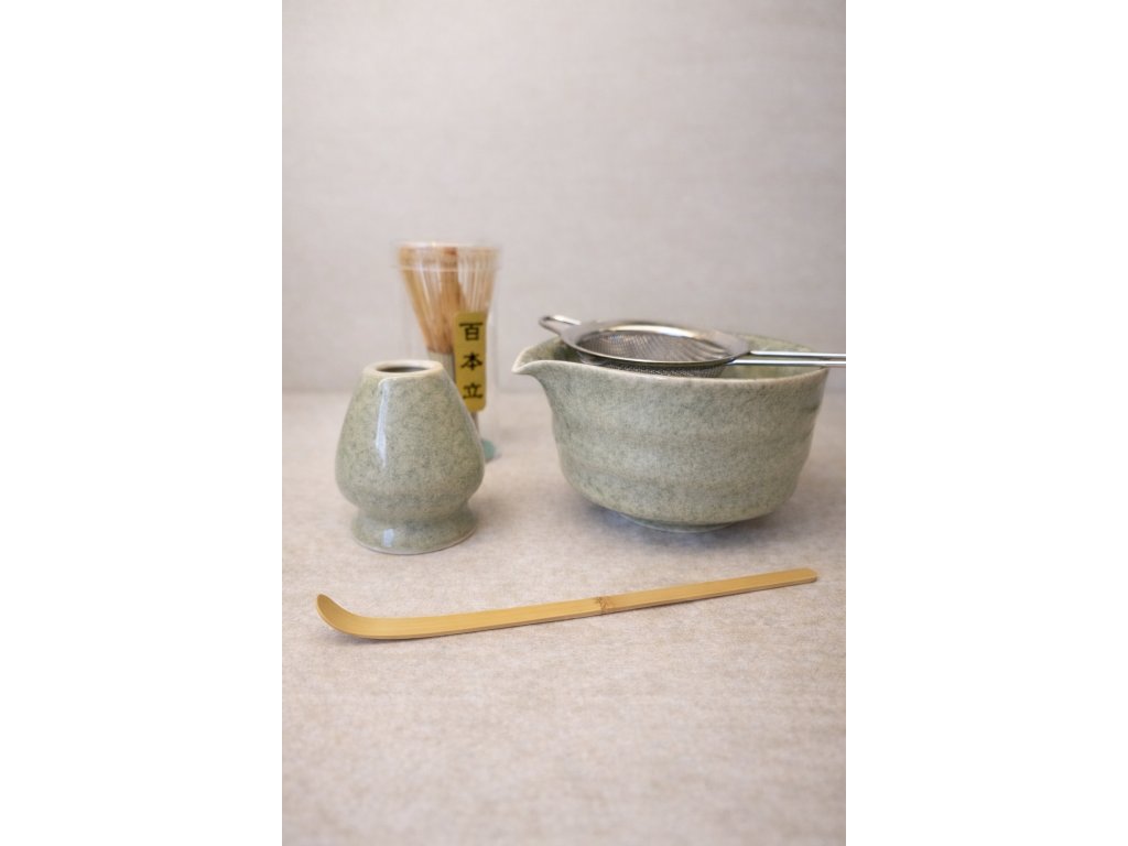 Set obsahuje: chawan (miska), chasen (metlička), chashaku (bambusová lžíce), stojan na metličku a nerezové sítko.