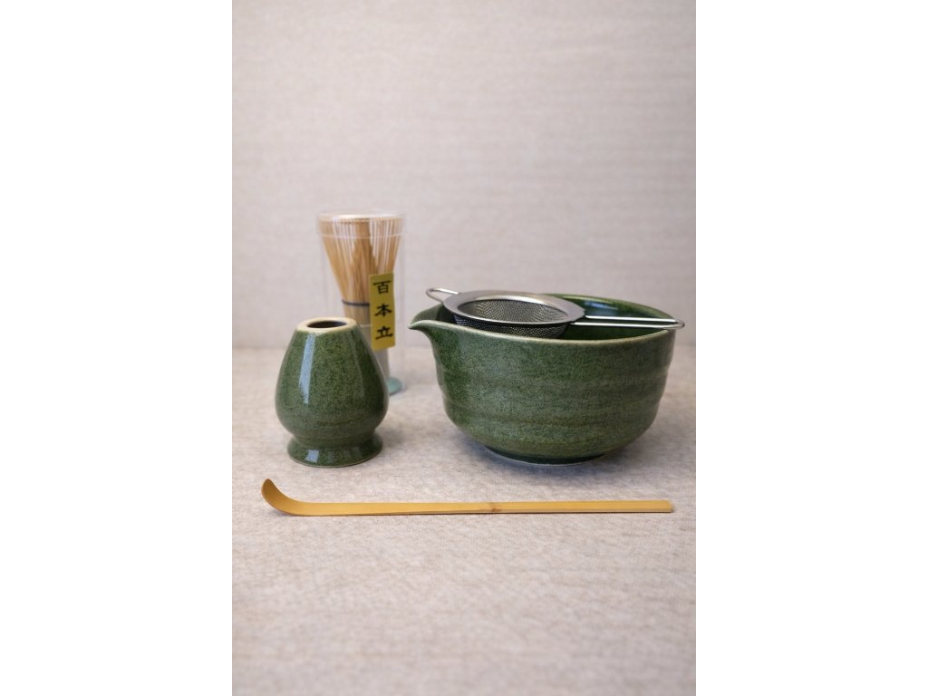 Set obsahuje: chawan (miska), chasen (metlička), chashaku (bambusová lžíce), stojan na metličku a nerezové sítko.
